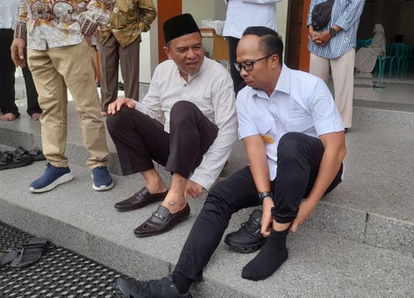 H. Yadi Mulyadi, SH berbincang dengan Viman Alfarizi Ramadhan, ST., MBA. saat peresmian masjid al Hamdi, Sabtu (28/2).